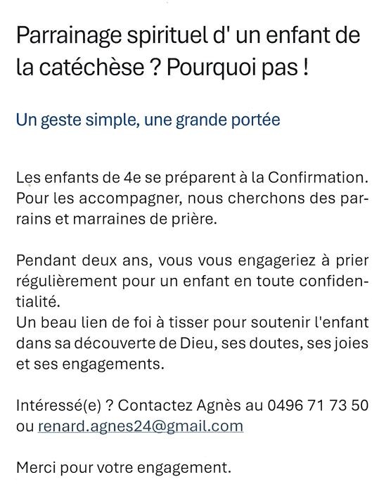 Enfin, nous souhaiterions que cette expérience soit validée par vous, parents, soit en nous rejoignant pour accompagner votre enfant, soit en étant présents à la messe, soit en autorisant votre enfant à nous rejoindre. Nous le prendrons en charge.